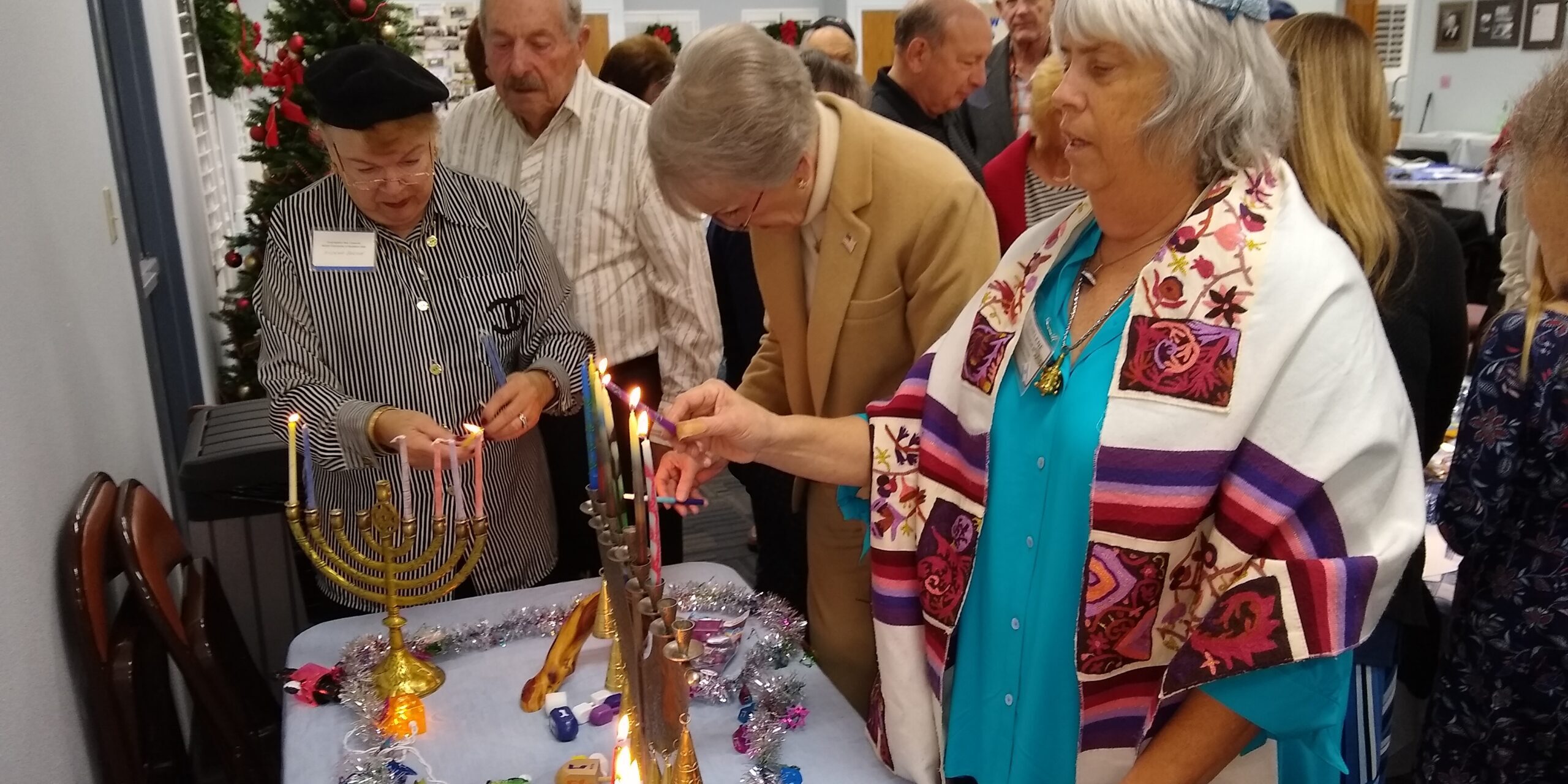 First Lighting the Hanukkiah, then Kindling the Sabbath candles, followed by the Shabbat Service. Please include the blessings for Hanukkah during your services at home on Saturday and the whole week, too.