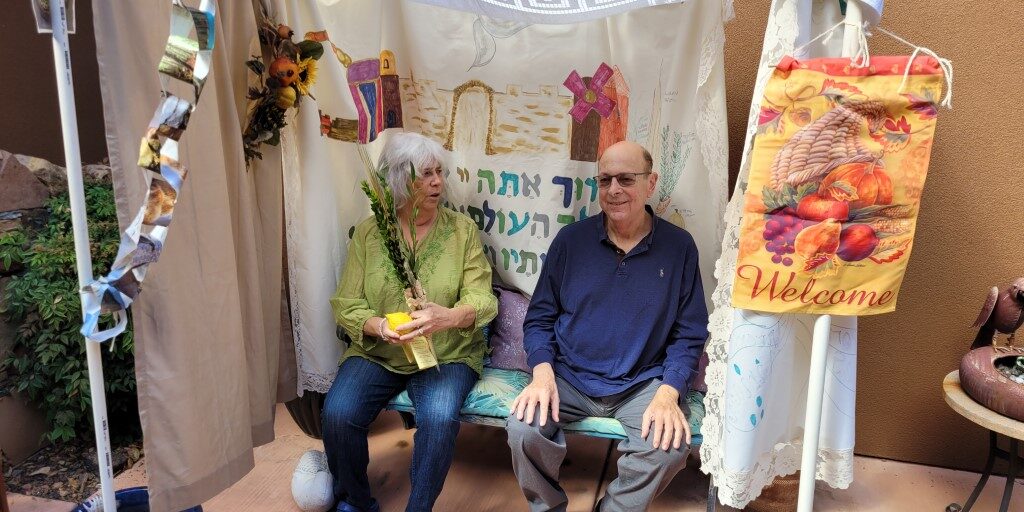 Last Shabbat was Erev Sukkot and the first day on Saturday. The congregation was invited to visit our Sukkah. Everyone that visited was able to shake the lulav and etrog, sit inside the sukkah, and enjoy a festive luncheon and desserts. We were blessed to have a beautiful day. Unfortunately our sukkah was damaged due to the heavy rains the following day. The panels appear to have dried up fine, and the artwork looks like a watercolor.